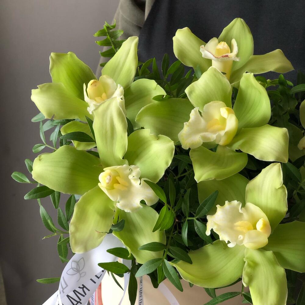 Шляпная коробка из тропических орхидей в сочетании с зеленью.